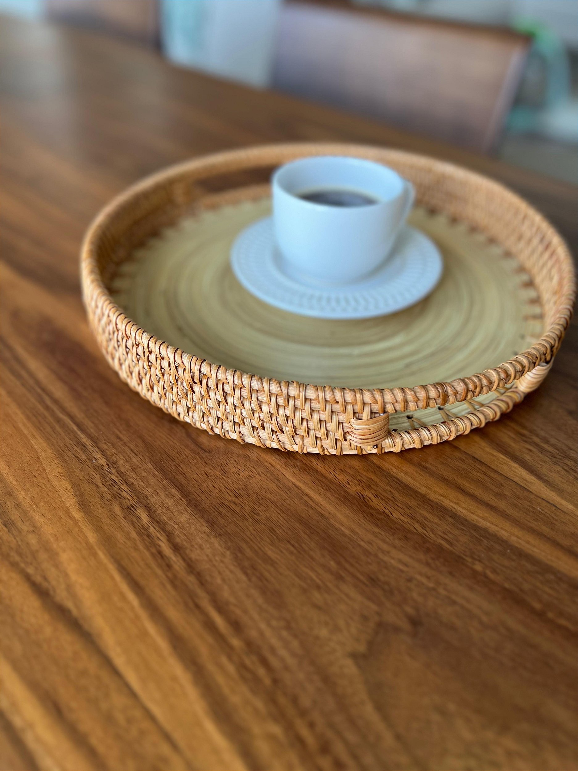 Bandeja artesanal, em bamboo com fundo amadeirado.