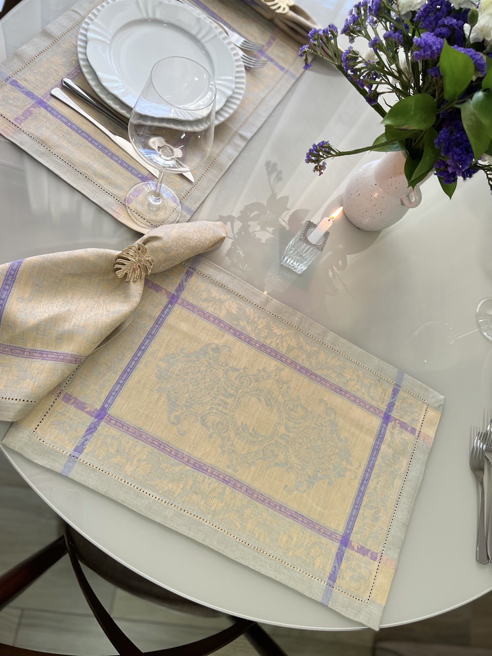 Jogo americano em formato retangular, de linho, suas tramas são trançadas e formam desenhos no estilo provençal. Guardanapo em formato quadrado, de linho, com tramas trançadas e forma desenhos semelhantes ao jogo americano.