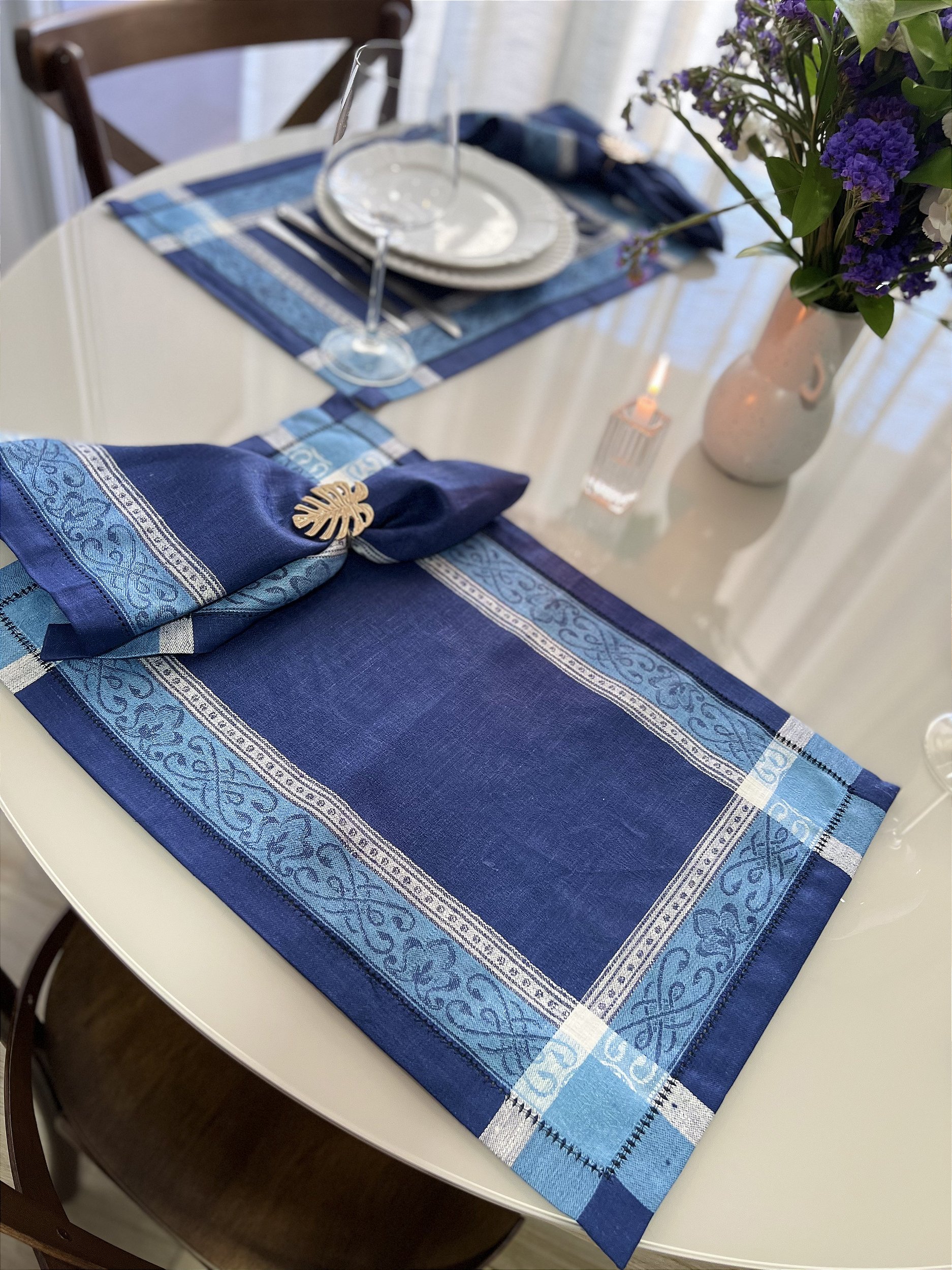 Jogo americano em formato retangular, de linho, suas tramas são trançadas e formam desenhos no estilo provençal. Guardanapo em formato quadrado, de linho, com tramas trançadas e forma desenhos semelhantes ao jogo americano.