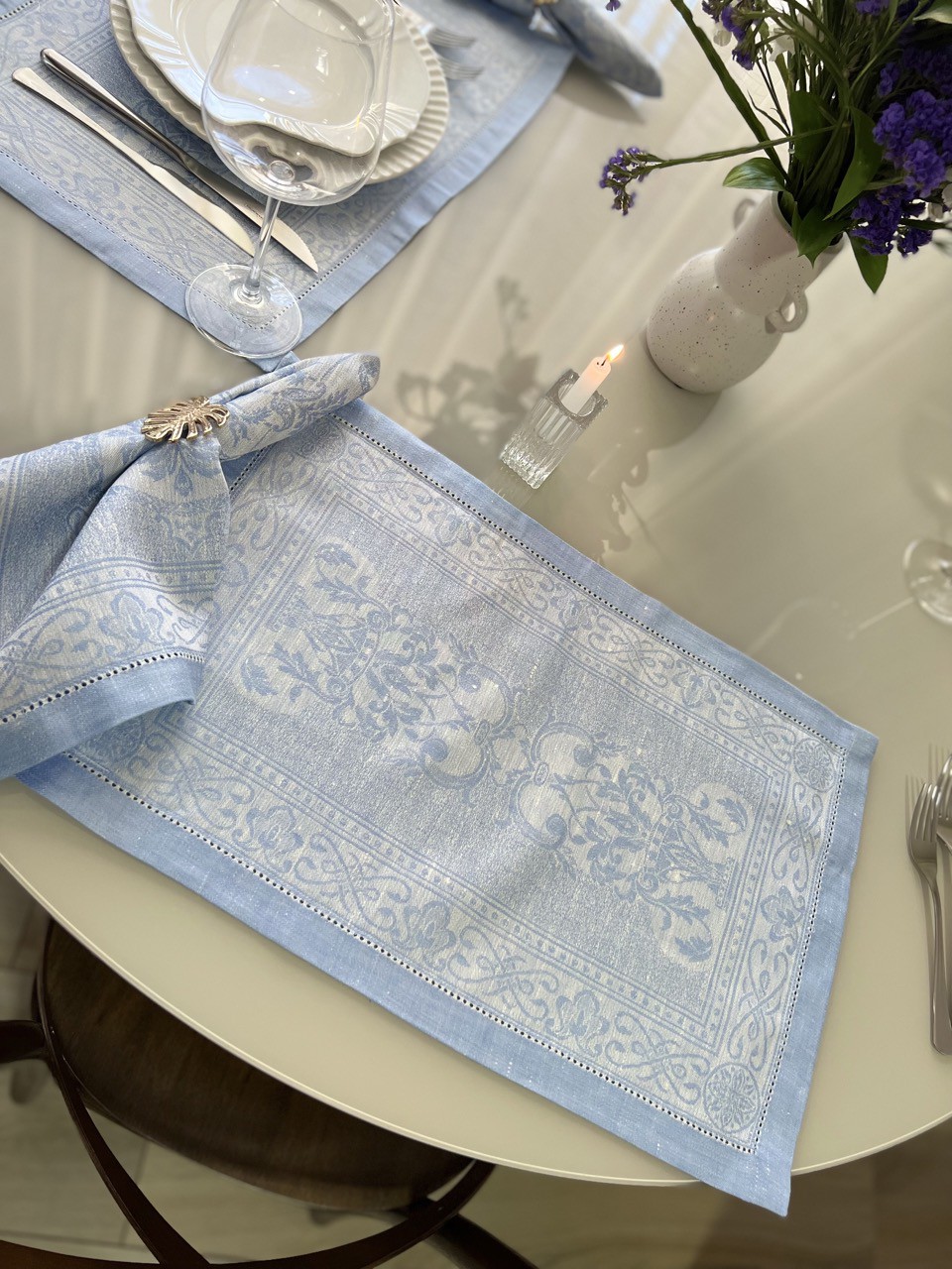 Jogo americano em formato retangular, de linho, suas tramas são trançadas e formam desenhos no estilo provençal. Guardanapo em formato quadrado, de linho, com tramas trançadas e forma desenhos semelhantes ao jogo americano.