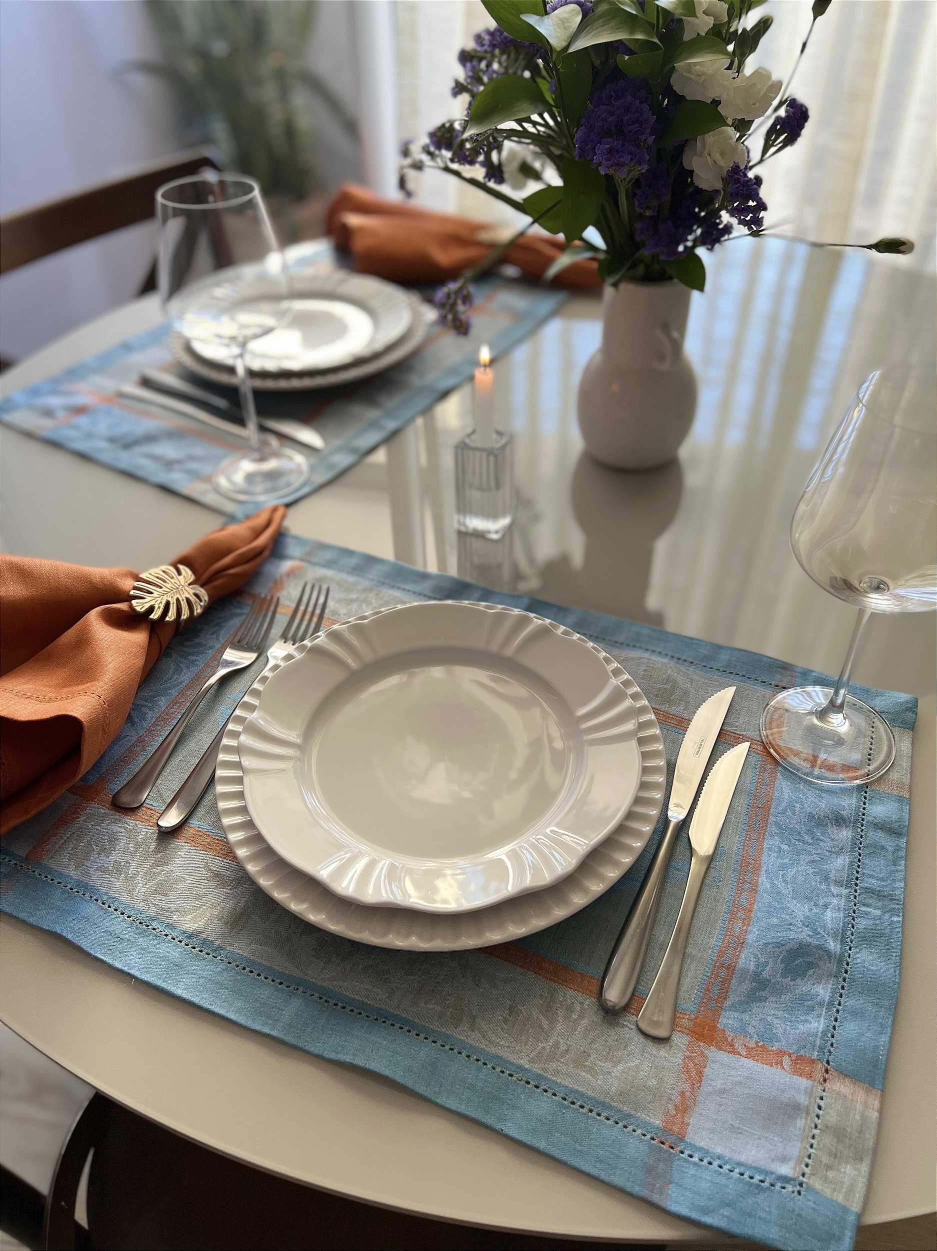 Jogo americano em formato retangular, de linho, suas tramas são trançadas e formam desenhos no estilo provençal. Guardanapo em formato quadrado, de linho, com tramas trançadas e forma desenhos semelhantes ao jogo americano.