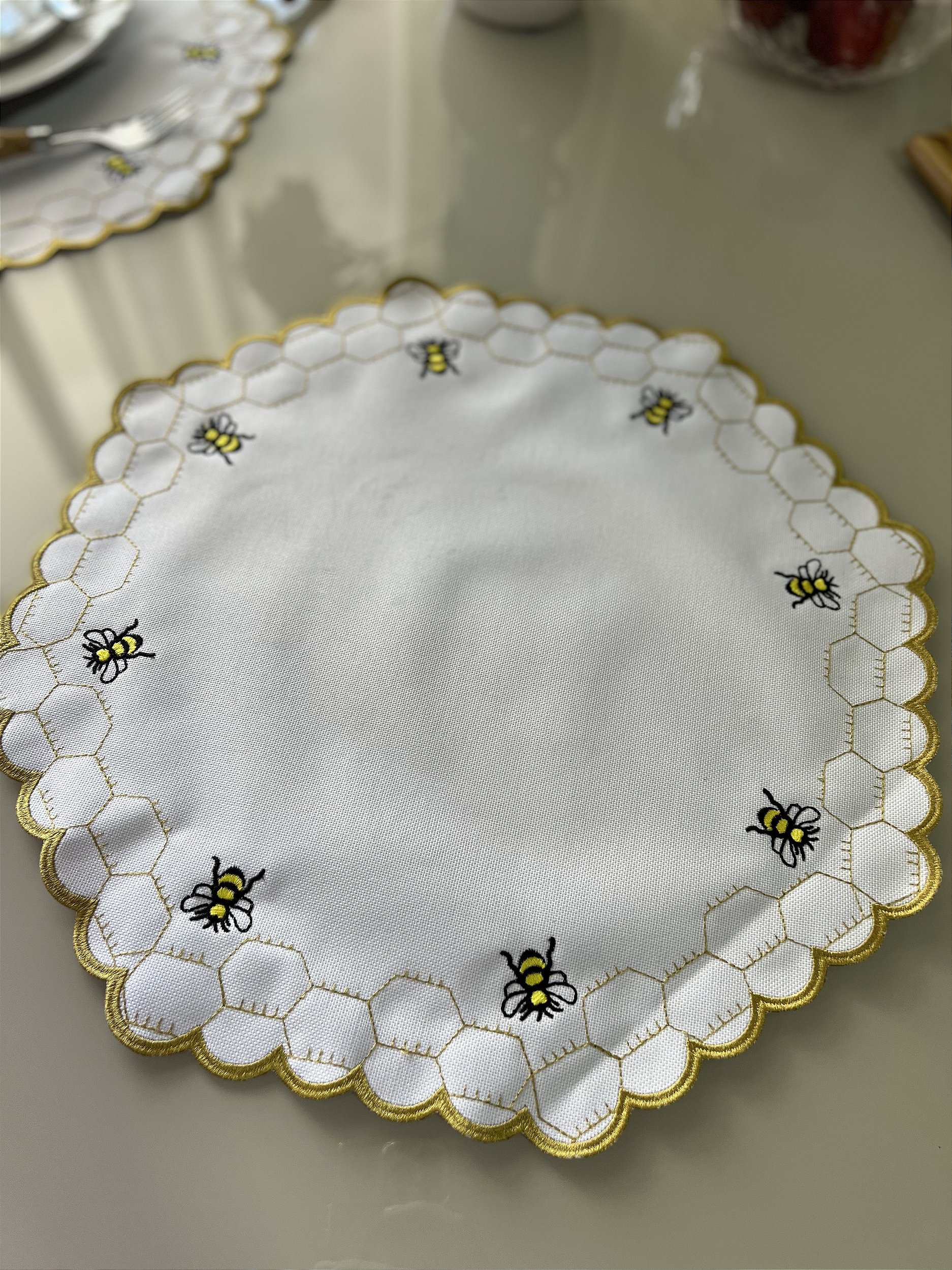 Descritivo: Jogo americano em formato redondo, de tecido sintético semi impermeável em tom branco, com bordado de colmeia e abelhas e acabamento bordado;
