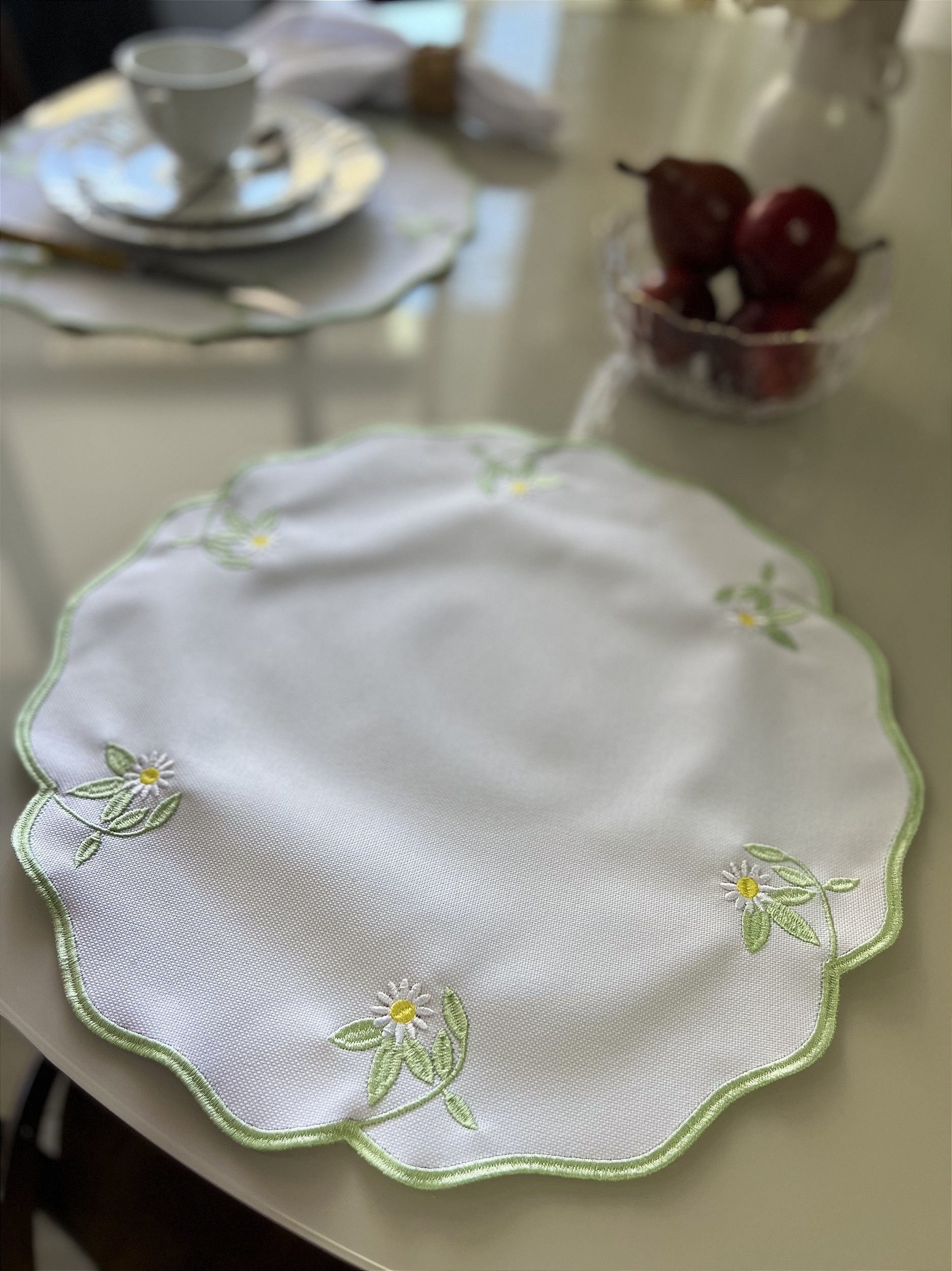 Descritivo: Jogo americano em formato redondo, de tecido sintético semi impermeável em tom branco, com bordado de margaridas brancas, com caule e folhas verdes e acabamento bordado;