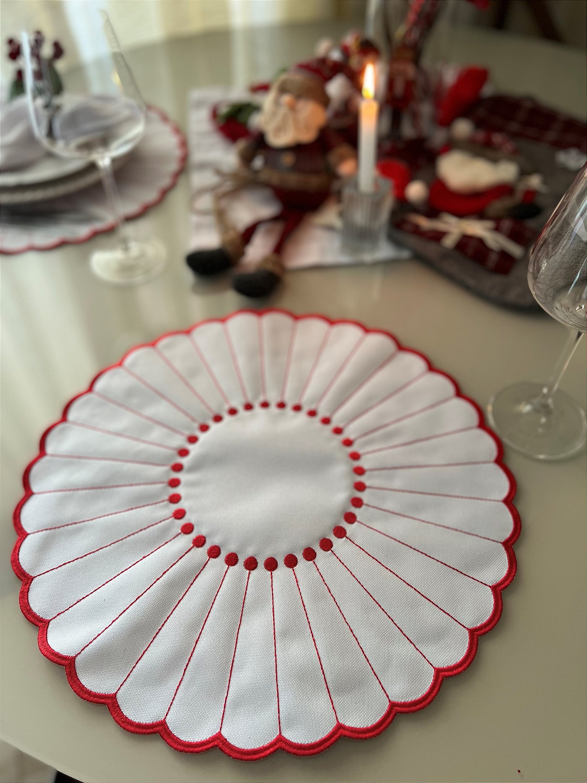 Descritivo: Jogo americano em formato redondo, de tecido sintético semi impermeável em tom branco, com bordado de pétalas e acabamento bordado, na cor vermelha;