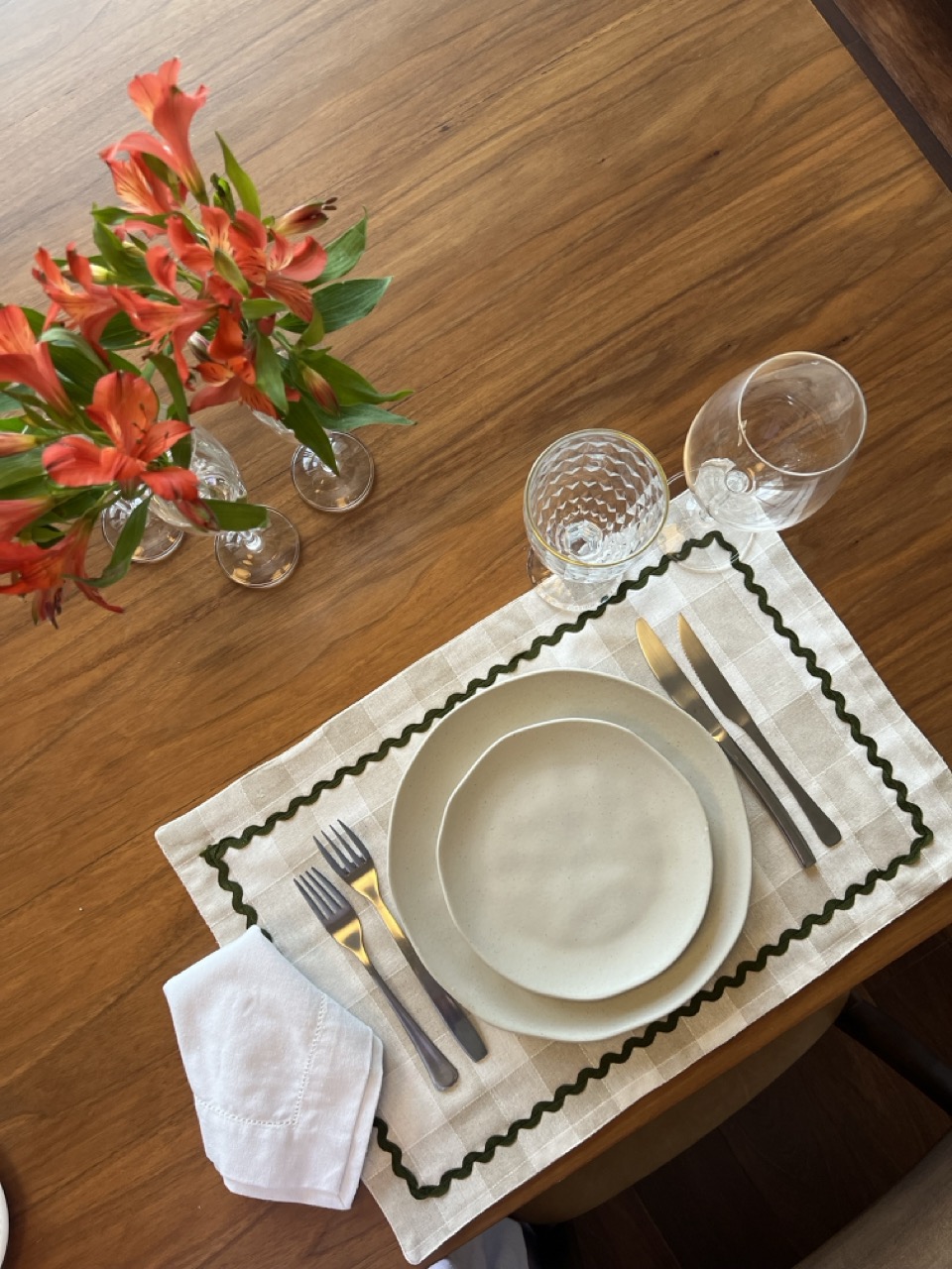 Jogo americano em tecido xadrez, bege com off white, com sianinha na cor verde militar.