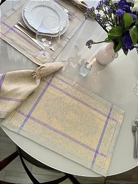 Jogo americano em formato retangular, de linho, suas tramas são trançadas e formam desenhos no estilo provençal. Guardanapo em formato quadrado, de linho, com tramas trançadas e forma desenhos semelhantes ao jogo americano.