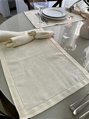 Jogo americano em formato retangular, de linho, suas tramas são trançadas e formam desenhos no estilo provençal. Guardanapo em formato quadrado, de linho, com tramas trançadas e forma desenhos semelhantes ao jogo americano.